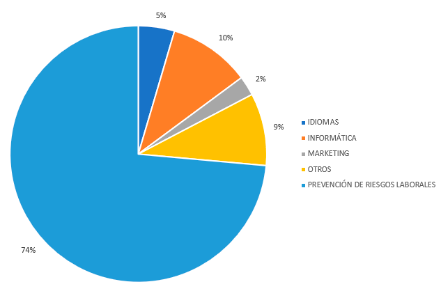 Como en años anteriores. la prevención de riesgos laborales es la principal área de formación, acaparando el 74% de las horas formativas. Informática, idiomas y marketing son las otras tres principales áreas, consolidando así la tendencia iniciada en el 2021.